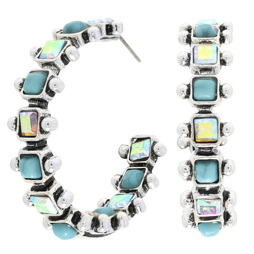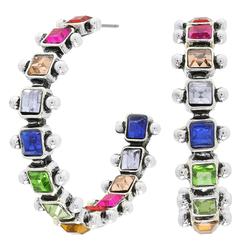 CRYSTAL HOOP POST EARRINGS IN OXIDIZED SILVER-TONE METAL
