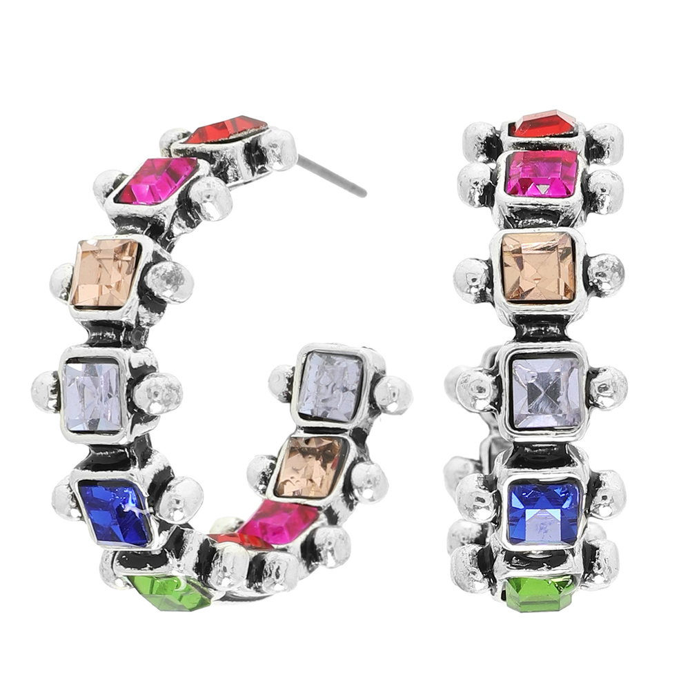CRYSTAL HOOP POST EARRINGS IN OXIDIZED SILVER-TONE METAL