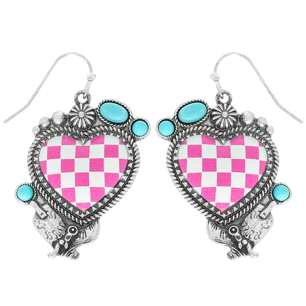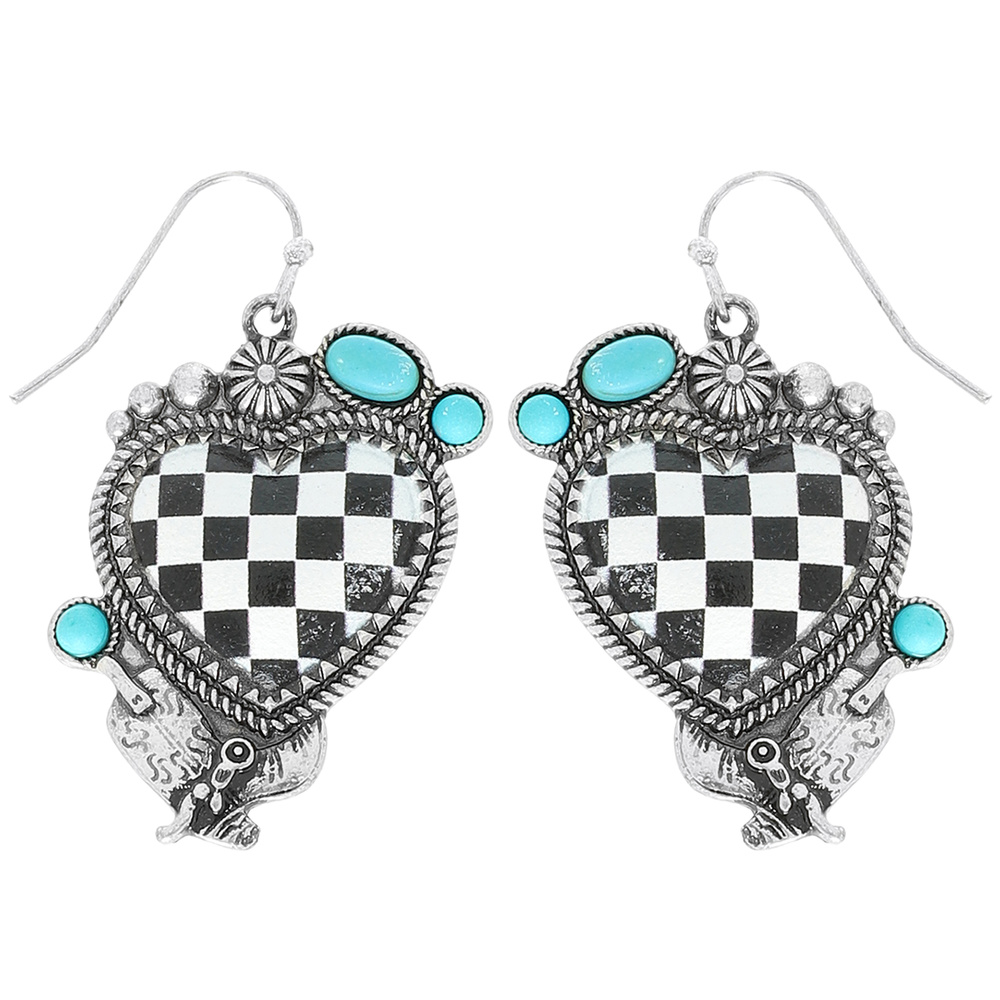 WESTERN TURQUOISE CHECKERED HEART DANGLE EARRINGS