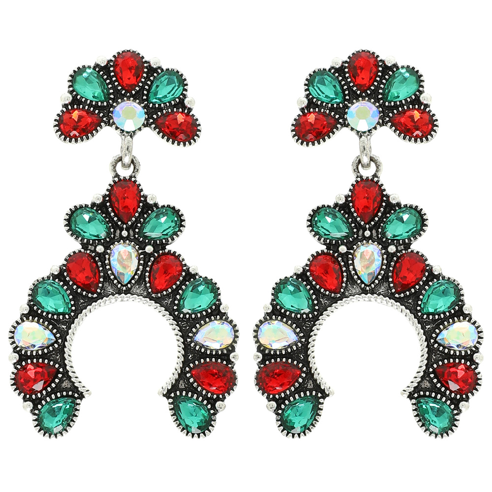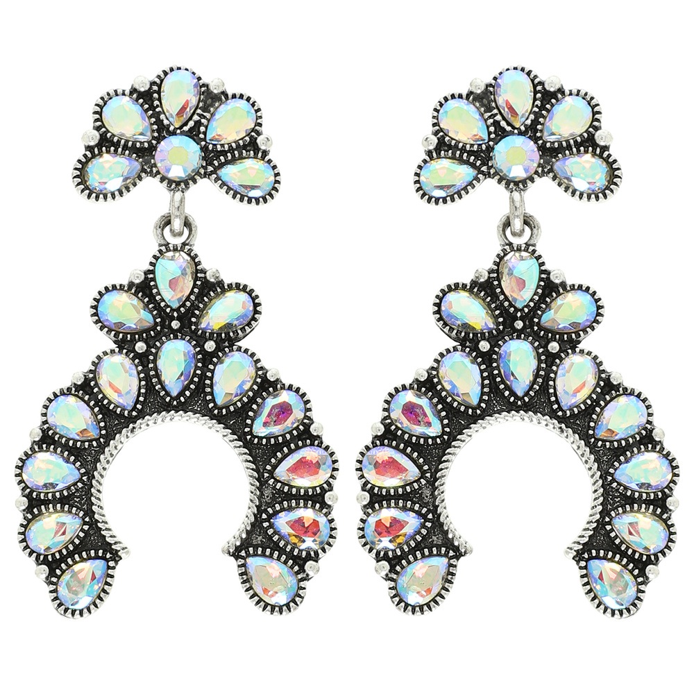 TWO-TIER CRYSTAL SQUASH BLOSSOM POST EARRINGS IN OXIDIZED SILVER-TONE METAL