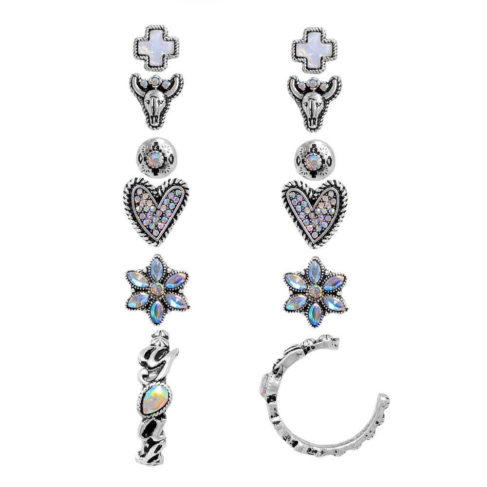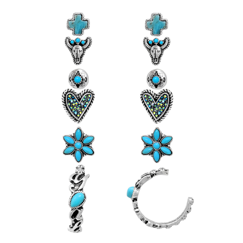6-PAIR WESTERN THEME ASSORTED CRYSTAL (OR) TURQUOISE POST EARRING SET