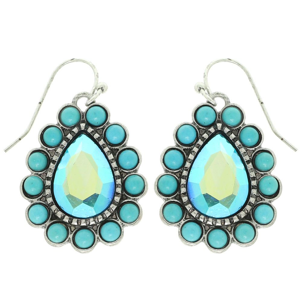 WESTERN TURQUOISE EMBELLISHED HALOED TEARDROP CUT CRYSTAL DANGLE EARRINGS