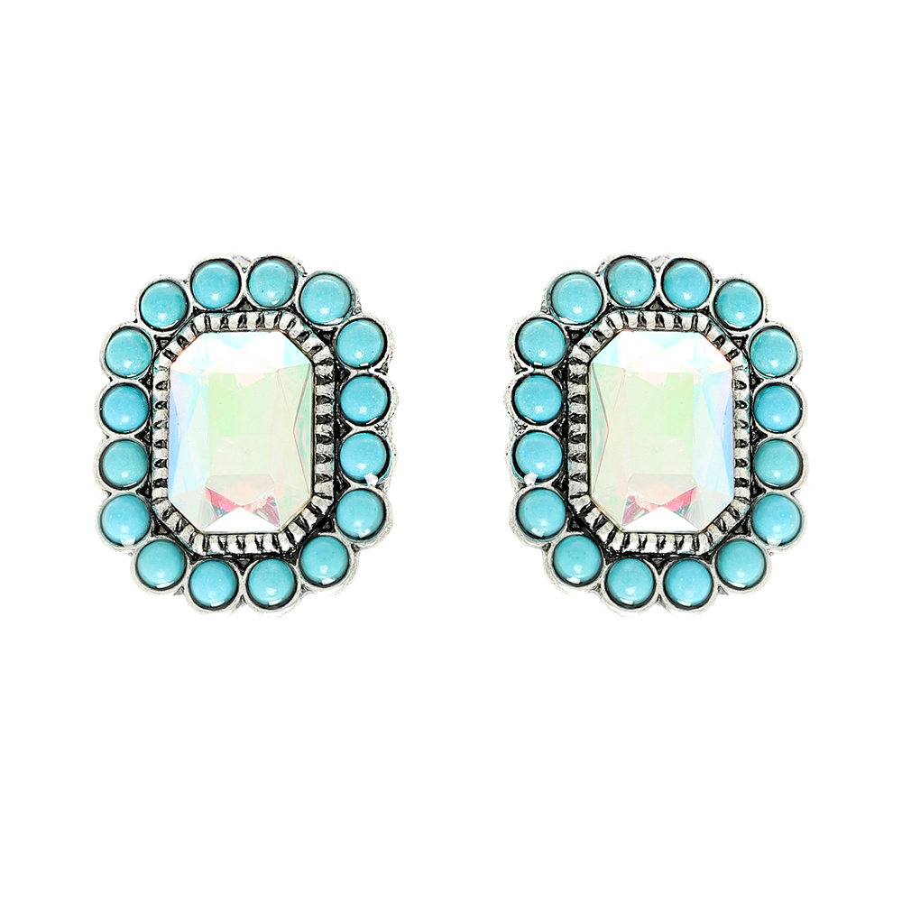 TURQUOISE EMBELLISHED OCTAGON CRYSTAL EARRINGS IN OXIDIZED SILVER-TONE METAL