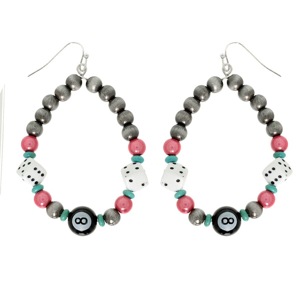TURQUOISE PEARL BEAD EIGHT-BALL LUCKY DICE OVAL HOOP EARRINGS