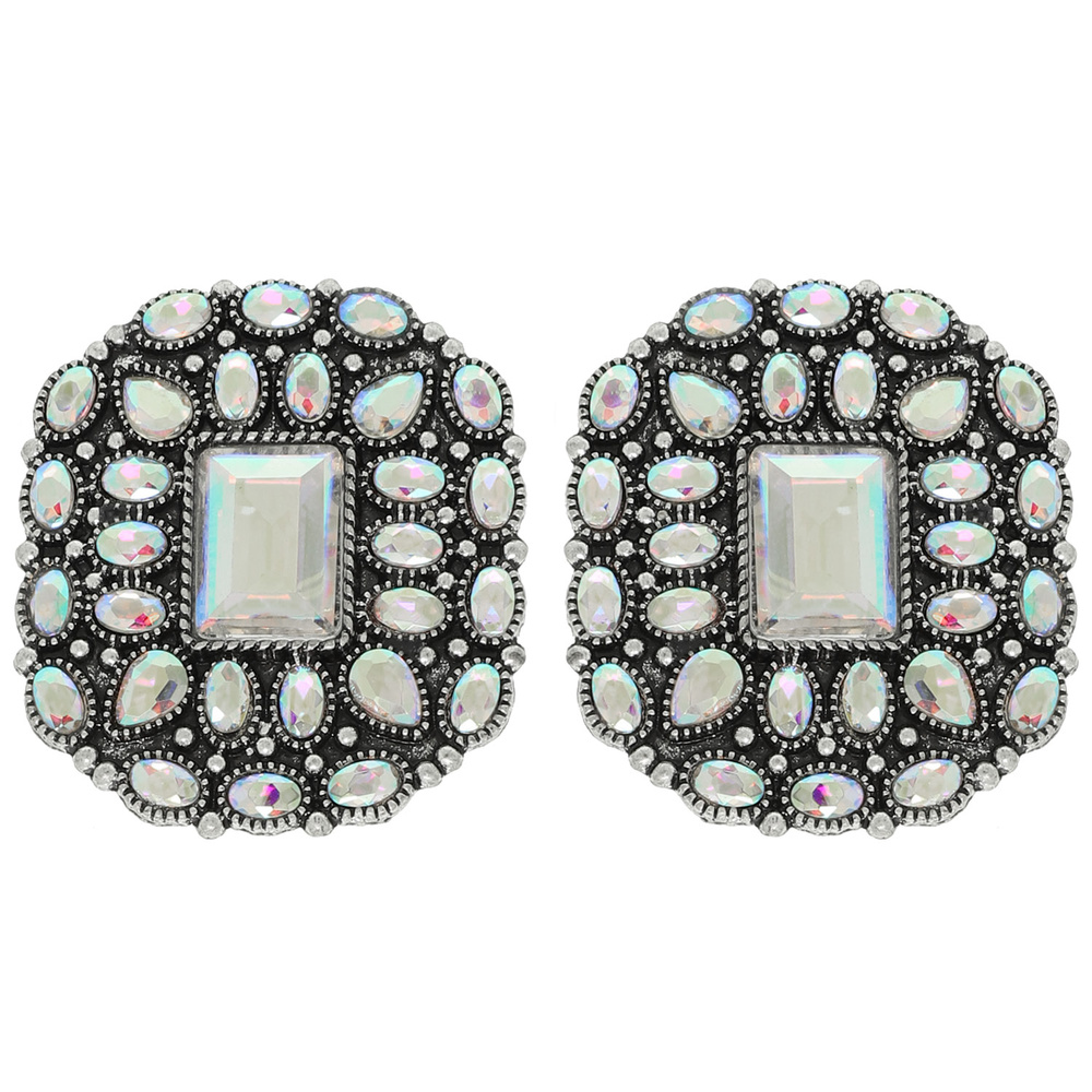 CRYSTAL EMBELLISHED CONCHO POST EARRINGS IN SILVER-TONE OXIDIZED METAL
