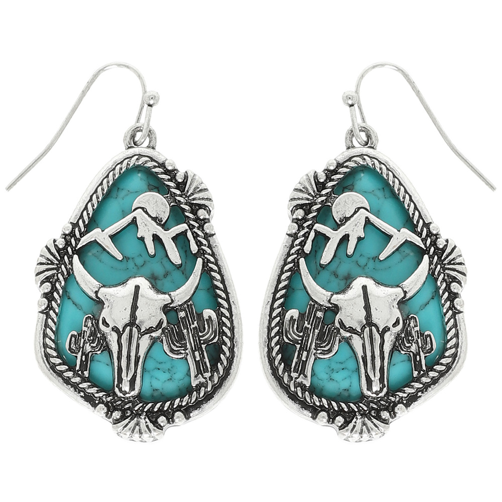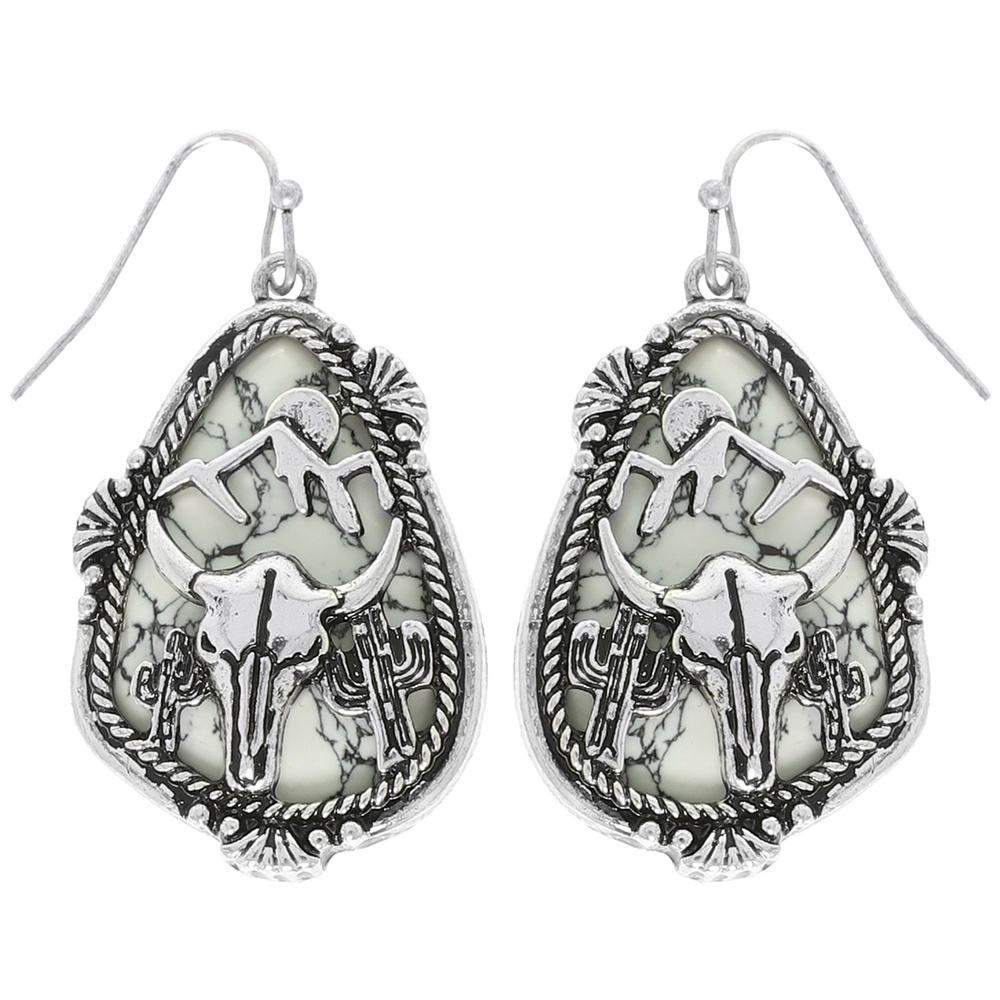 MAGNESITE EMBELLISHED OX SKULL DANGLE EARRINGS IN SILVER-TONE OXIDIZED METAL