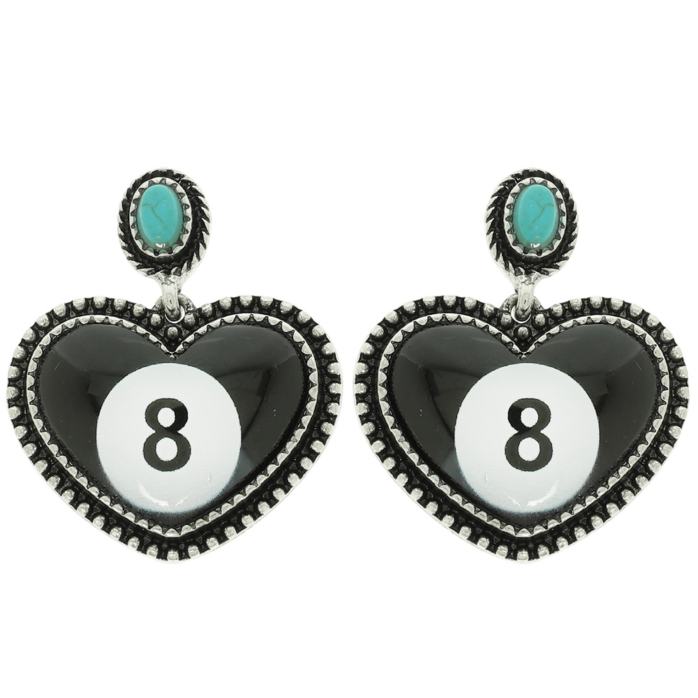 WESTERN TURQUOISE EMBELLISHED 8 BALL HEART POST DANGLE EARRINGS