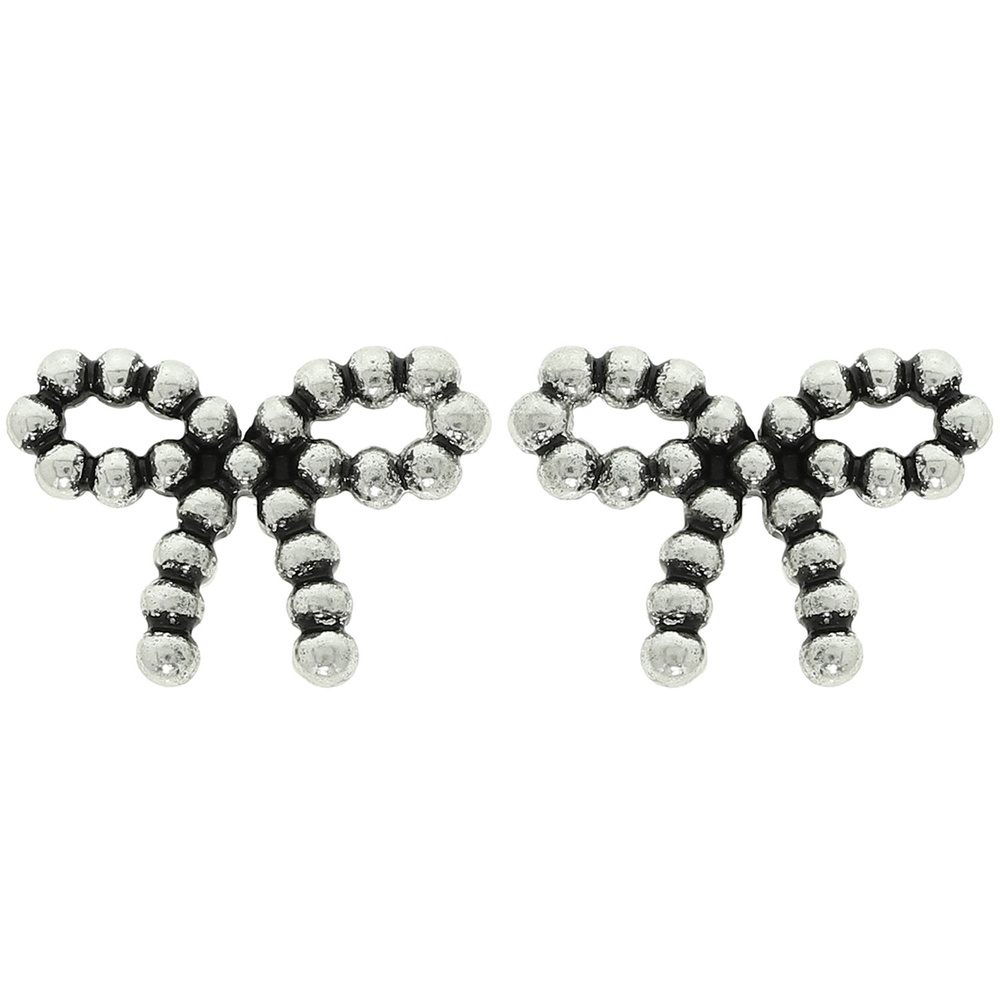 BUBBLE BEADED LONG TAIL BOW POST EARRINGS IN OXIDIZED SILVER-TONE METAL