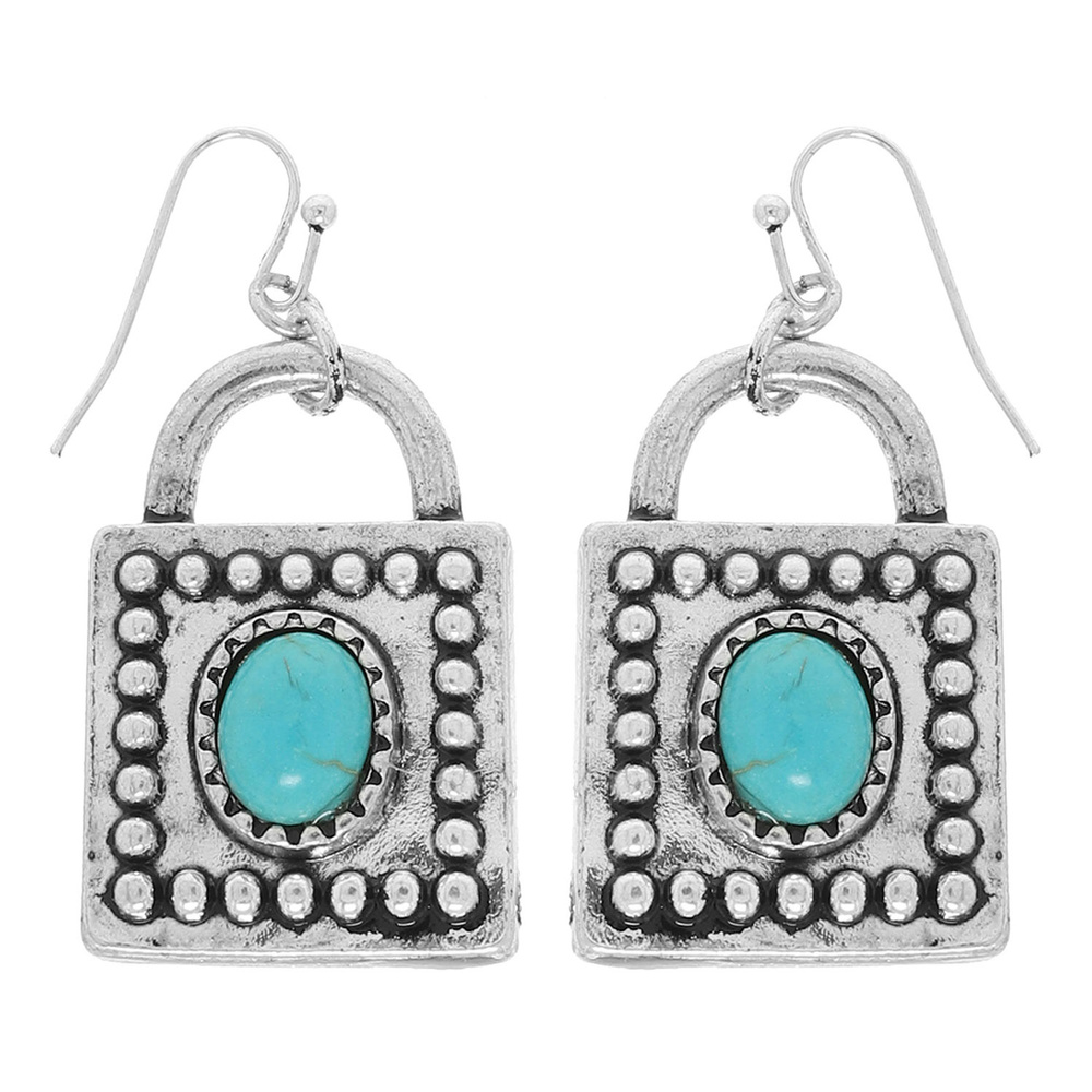 TURQUOISE EMBELLISHED SQUARE LOCKET DANGLE EARRINGS IN SILVER-TONE OXIDIZED METAL