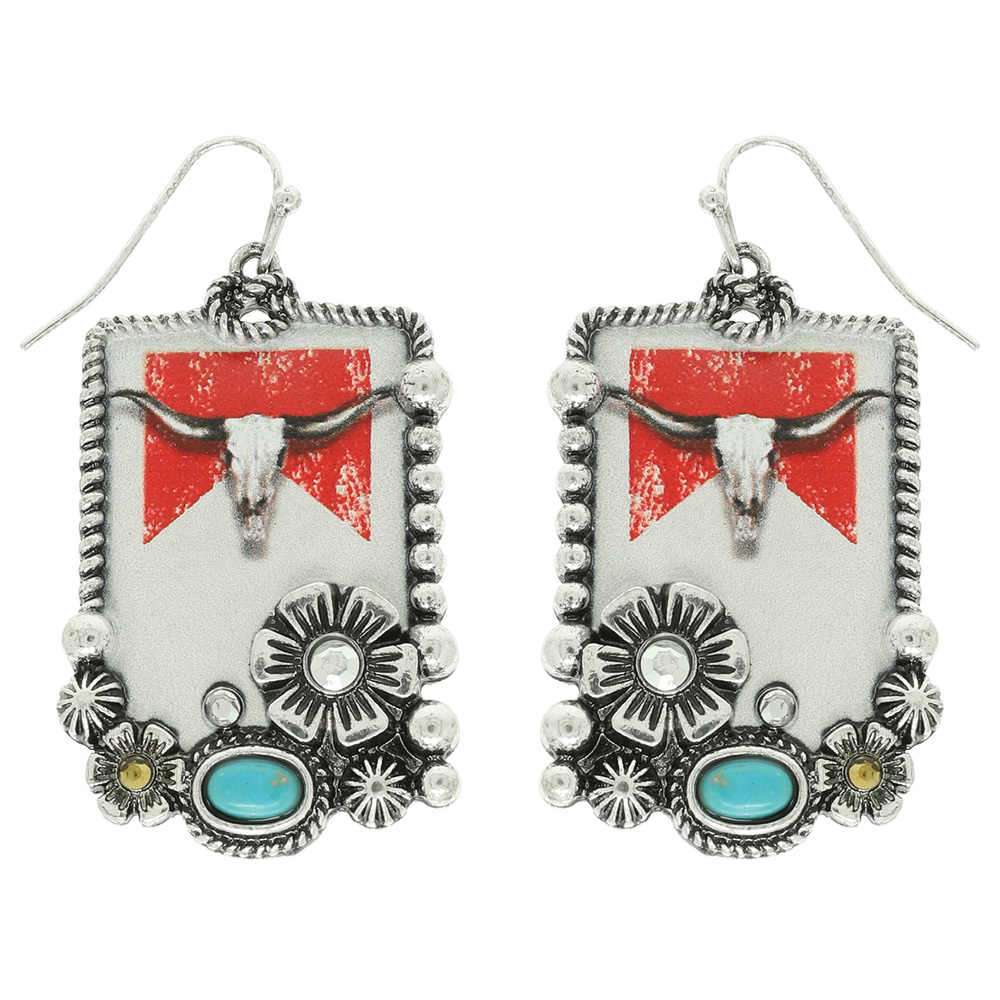 WESTERN STEERHEAD CONCHO EARRINGS WITH FLORAL TURQUOISE AND CRYSTAL ACCENTS