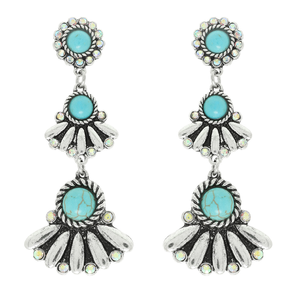 WESTERN SQUASH BLOSSOM POST DANGLE EARRINGS WITH TURQUOISE AND CRYSTAL ACCENTS