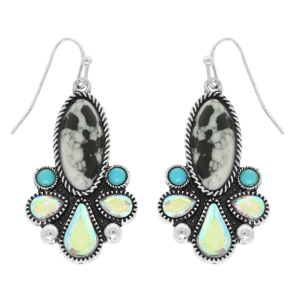 FLORAL COLORED OVAL TURQUOISE SQUASH BLOSSOM EARRINGS WITH CRYSTAL ACCECNTS