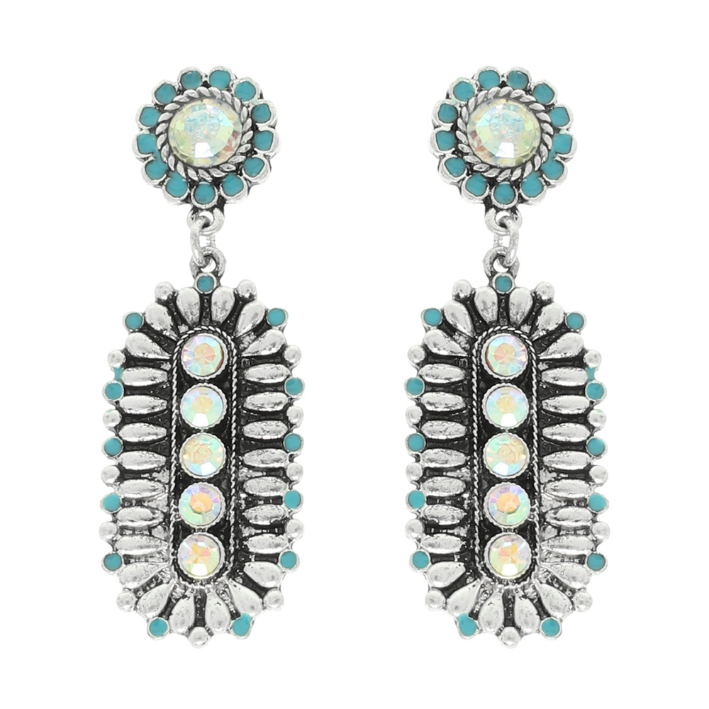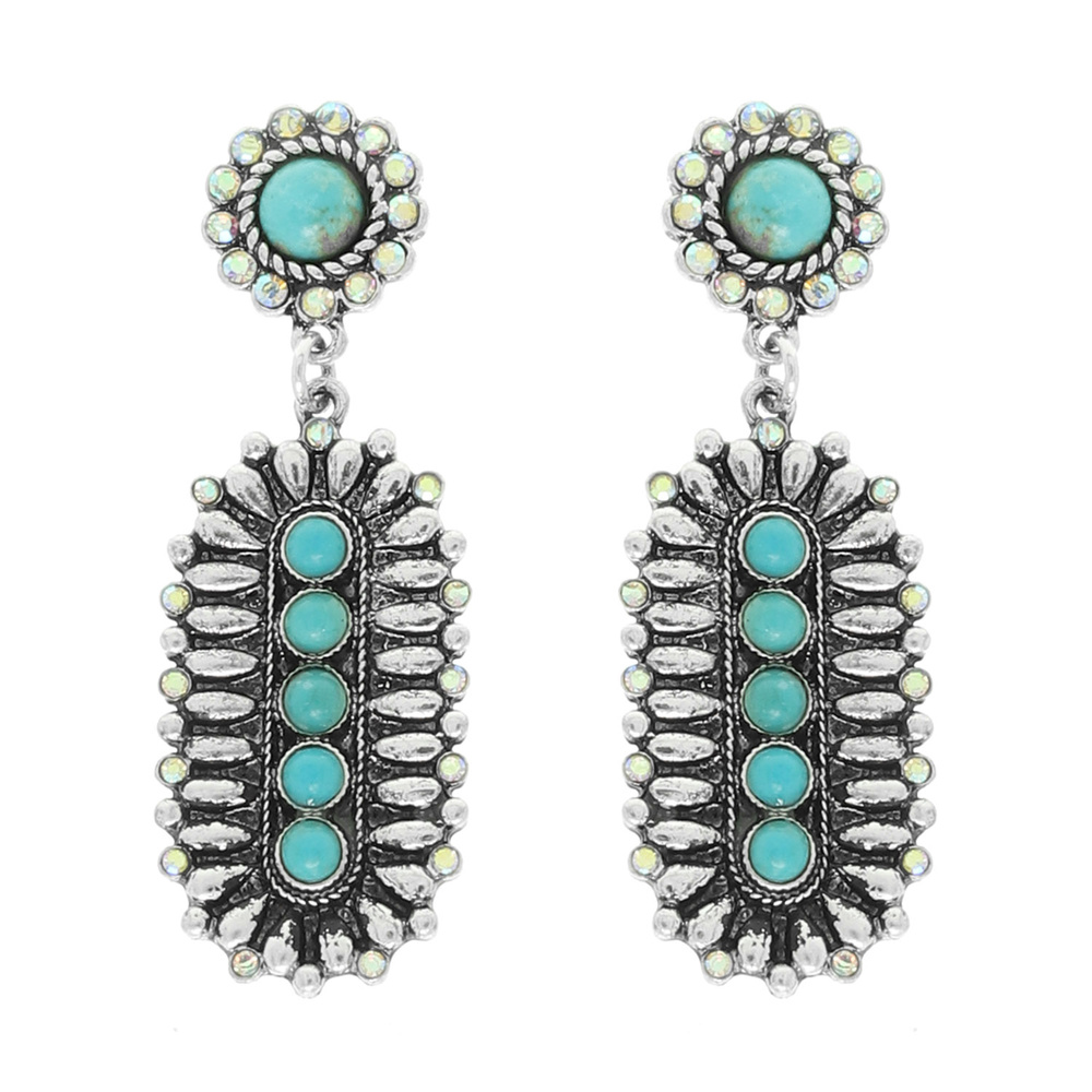 TURQUOISE CRYSTAL EMBELLISHED OVAL CONCHO DANGLE EARRINGS IN OXIDIZED SILVER-TONE METAL