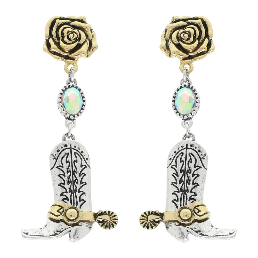 WESTERN COWBOY BOOT AND ROSE CHARM DANGLE EARRINGS WITH CRYSTAL ACCENTS