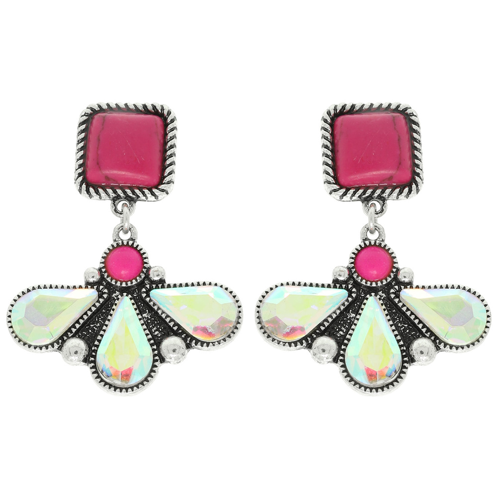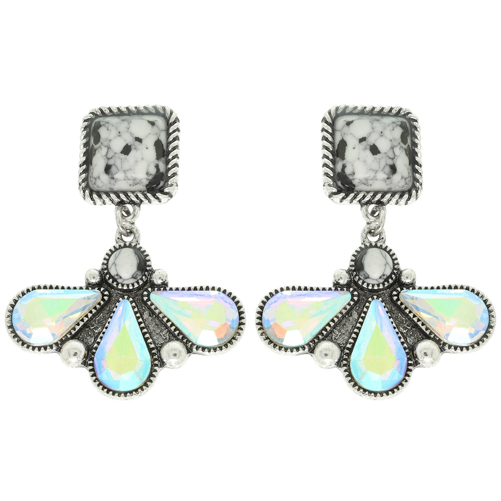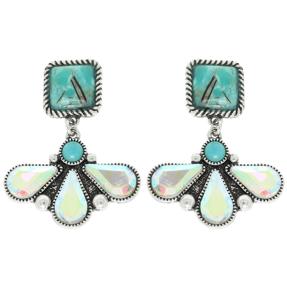 FLORAL COLORED SQUARE TURQUOISE SQUASH BLOSSOM EARRINGS WITH CRYSTAL ACCECNTS