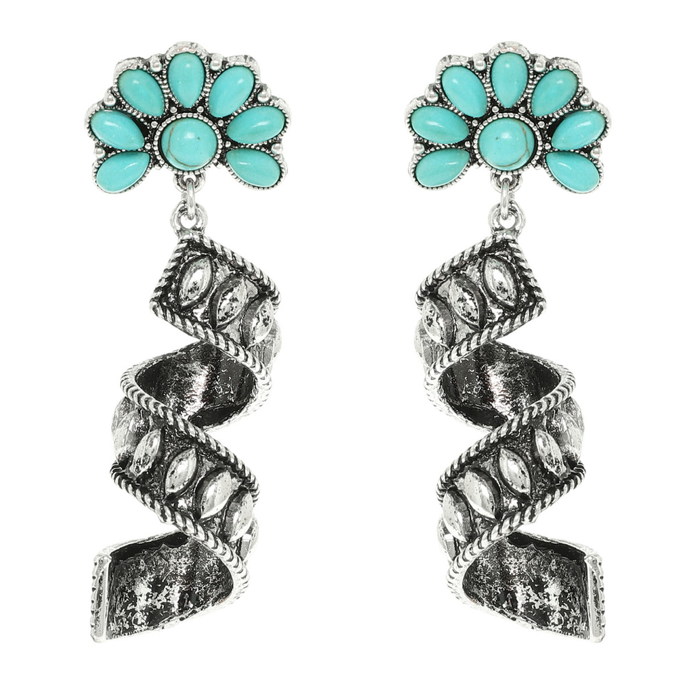 WESTERN TURQUOISE CONCHO EARRINGS WITH FAN TURQUOISE STUD TOP IN OXIDIZED SILVER TONE METAL