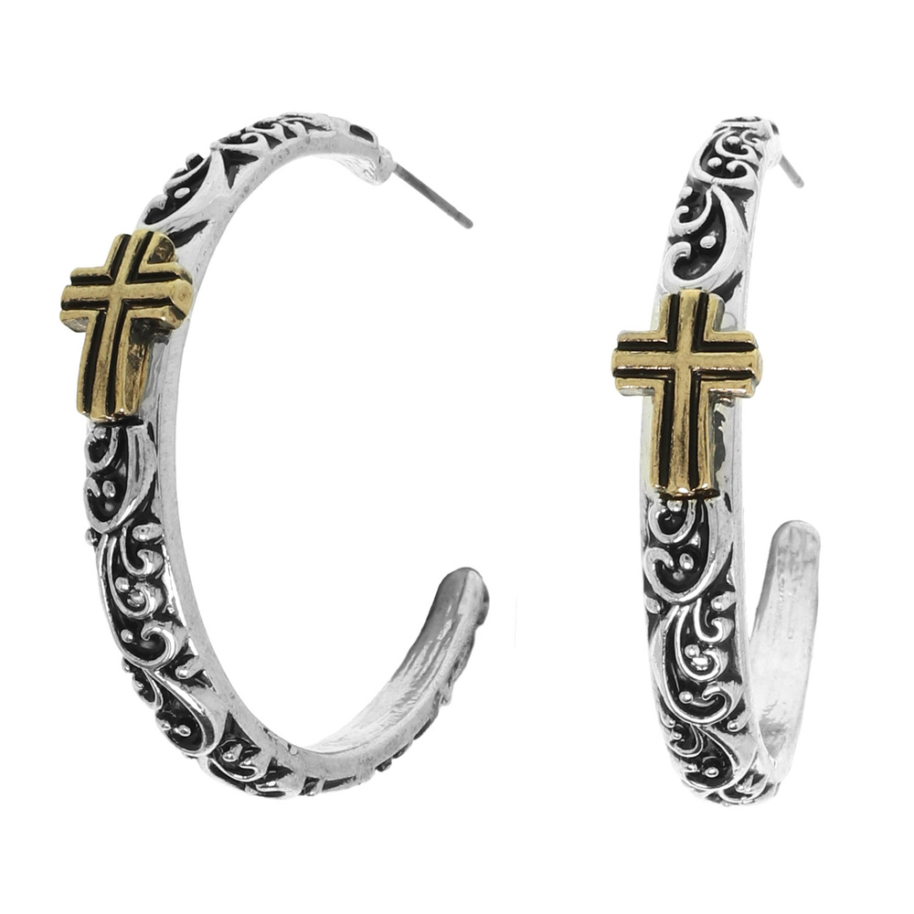 WESTERN TAILORED FILIGREE CROSS DESIGN HOOP EARRINGS IN OXIDIZED SILVER TONE AND GOLD TONE METAL