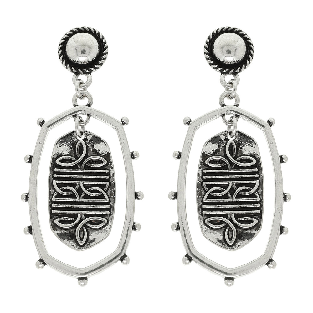 WESTERN BOOT STITCH OVAL SHAPE DANGLE EARRINGS IN OXIDIZED SILVER TONE METAL