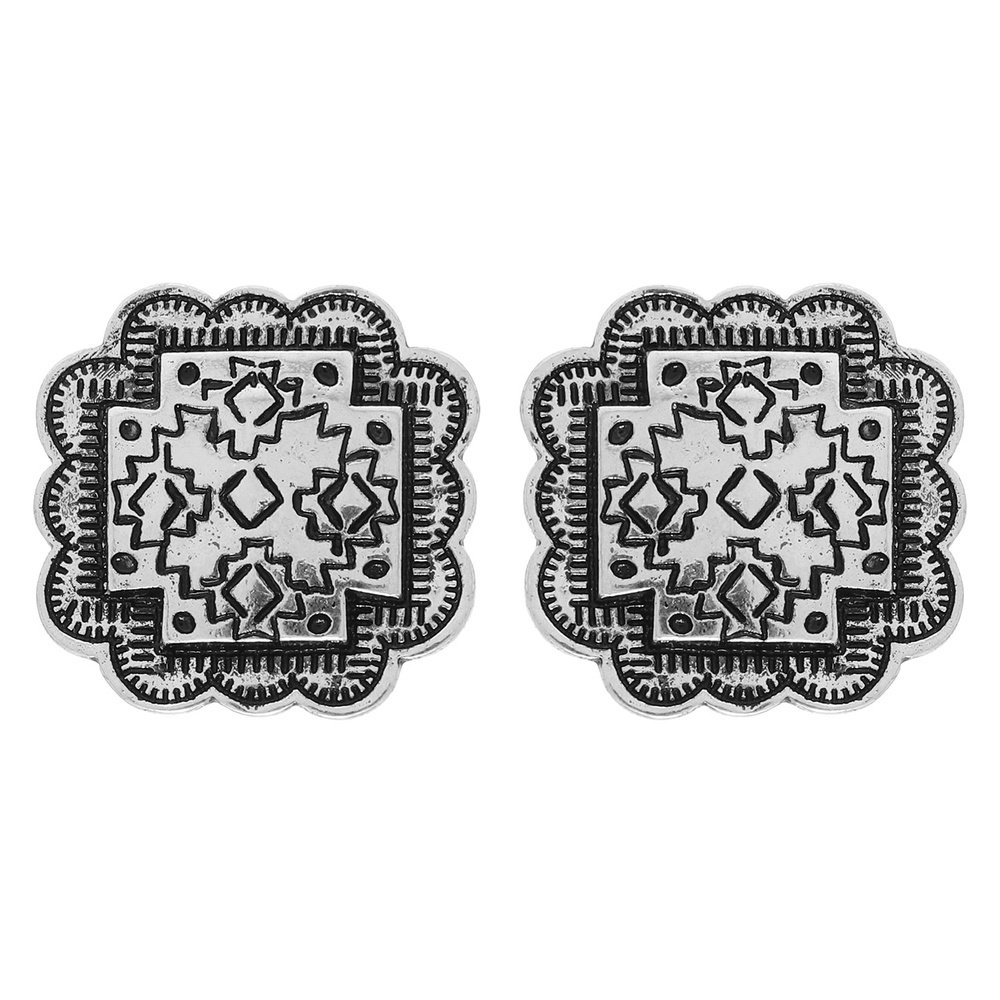 WESTERN AZTEC PICTOGRAPH ETCHED SCALLOP CONCHO EARRINGS IN OXIDIZED SILVER TONE METAL