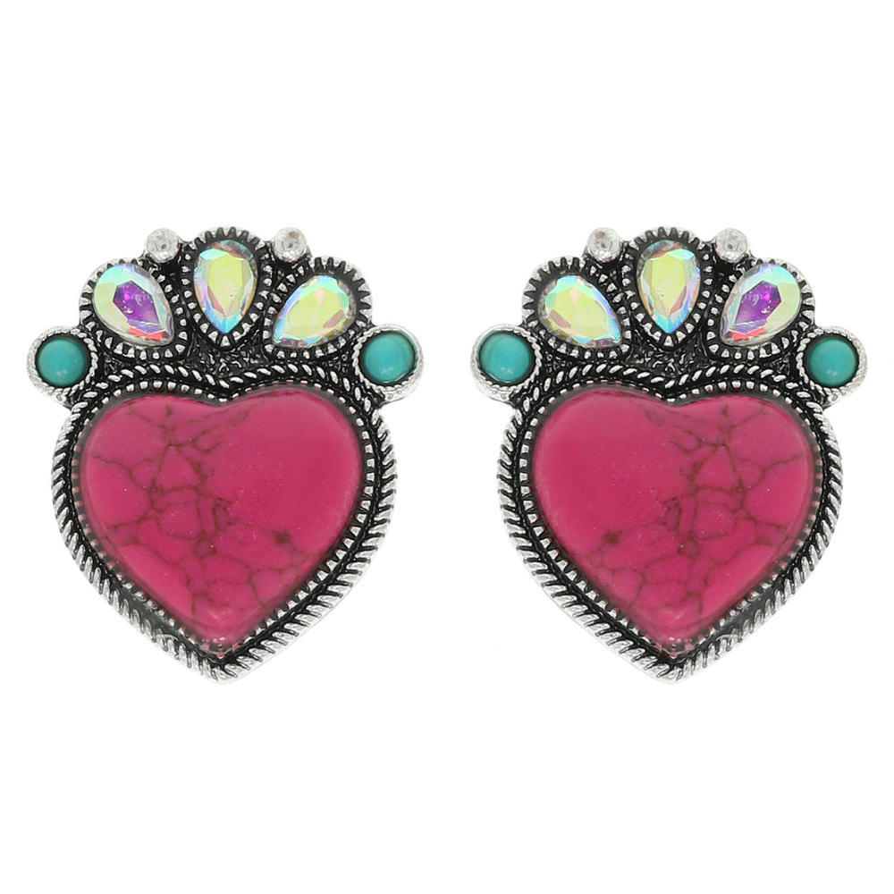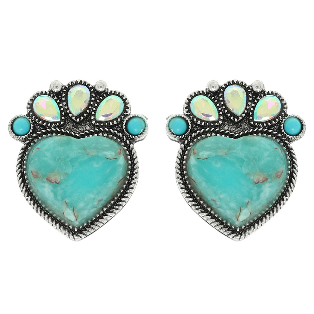 WESTERN HEART STUD EARRINGS IN OXIDIZED SILVER TONE METAL WITH TURQUOISE AND CRYSTAL ACCENTS