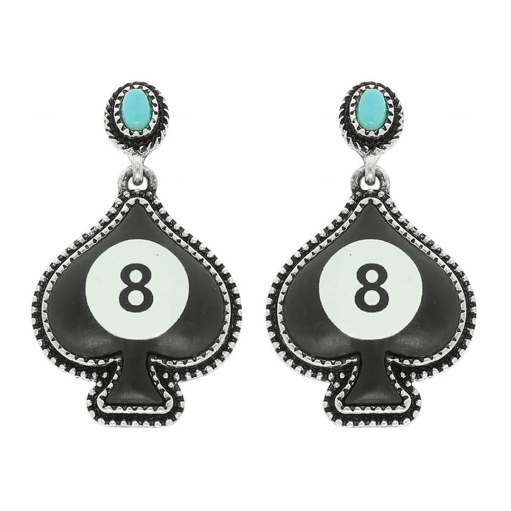 WESTERN EIGHT BALL POST DANGLE EARRINGS WITH TURQUOISE ACCENT IN OXIDIZED SILVER TONE METAL