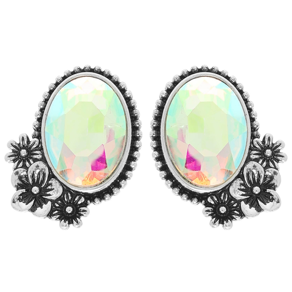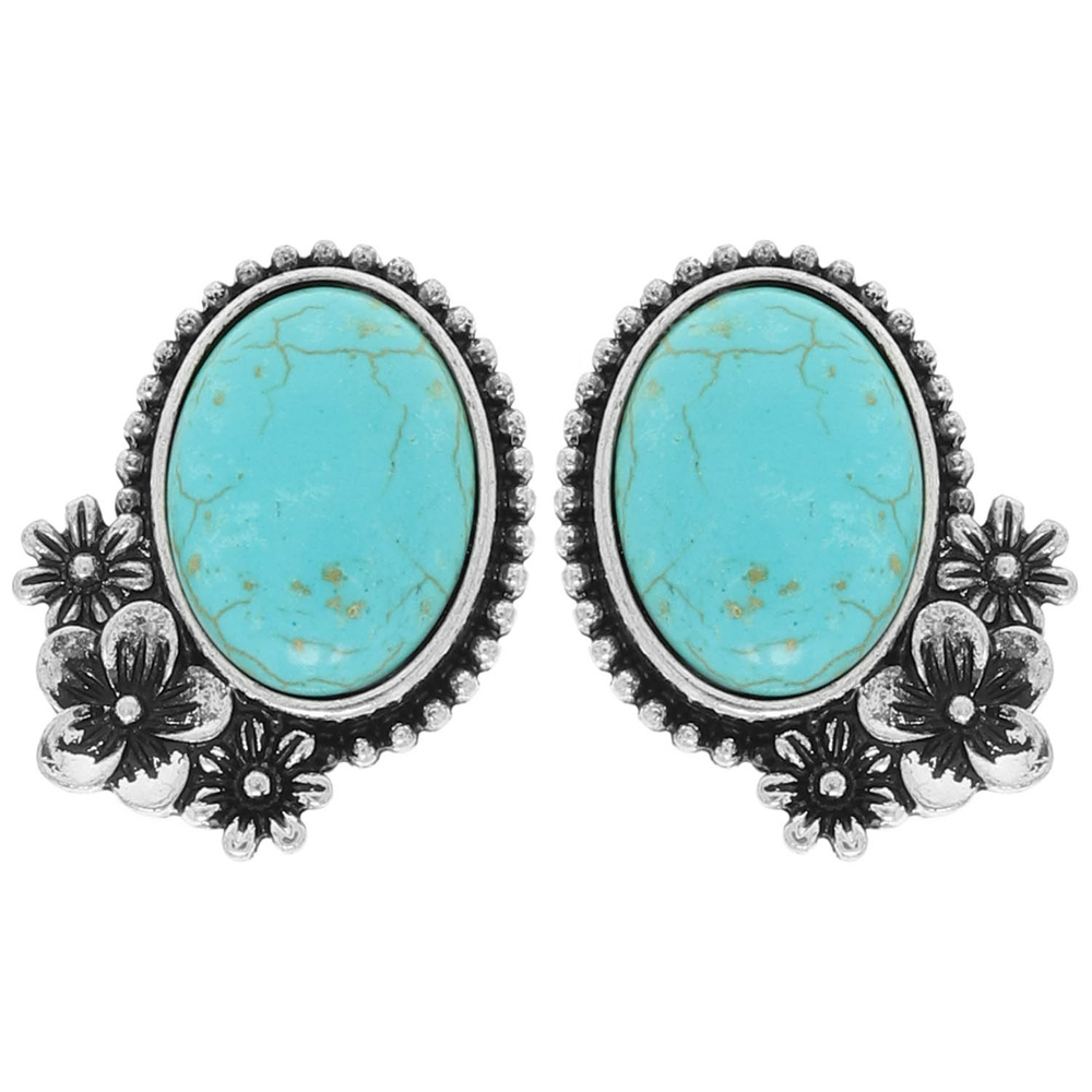 WESTERN FLORAL OVAL CRYSTAL OR TURQUOISE STUD EARRINGS WITH FLOWER TRIM IN OXIDIZED SILVER TONE METAL
