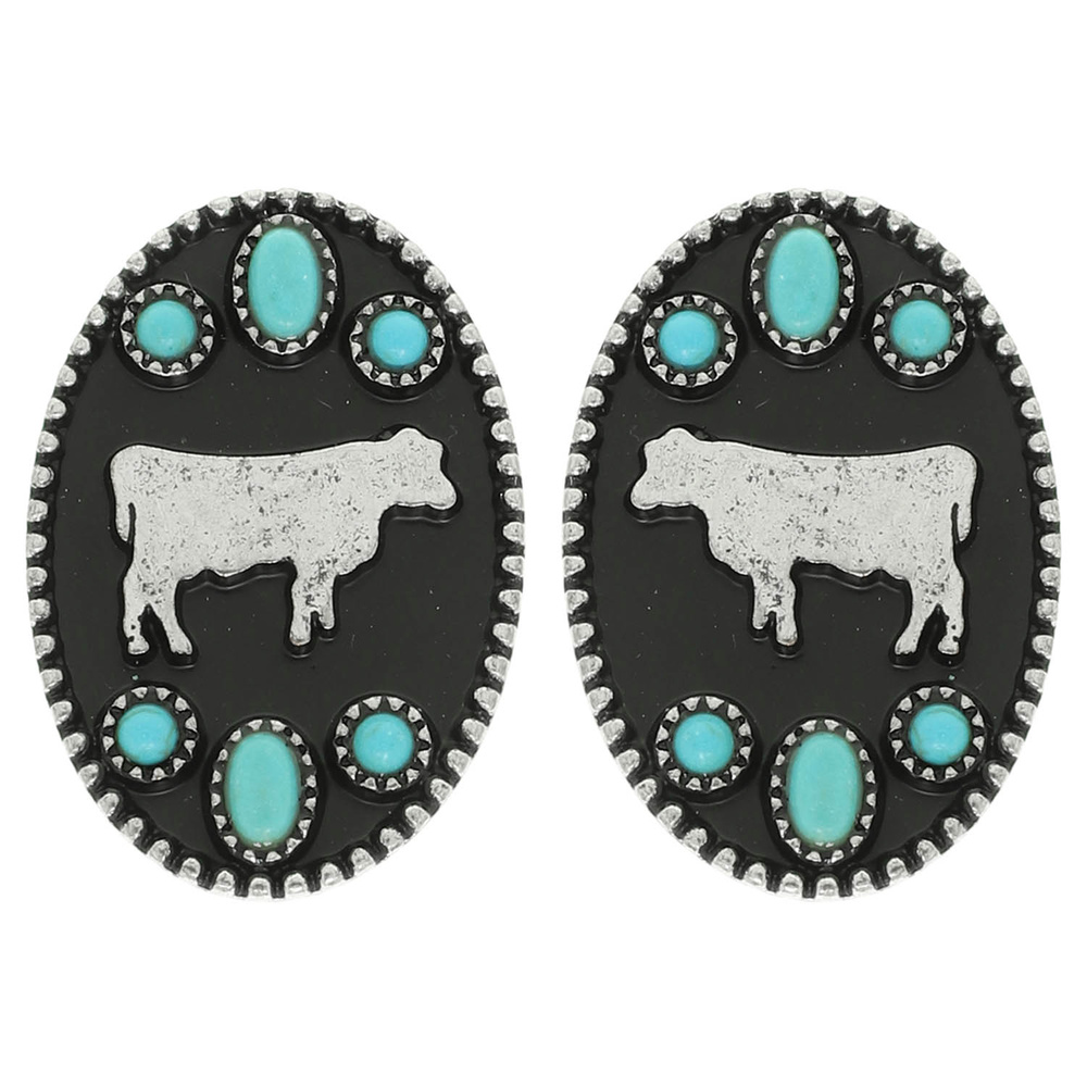 WESTERN OVAL COW STUD EARRINGS WITH TURQUOISE ACCENTS IN OXIDIZED SILVER TONE METAL