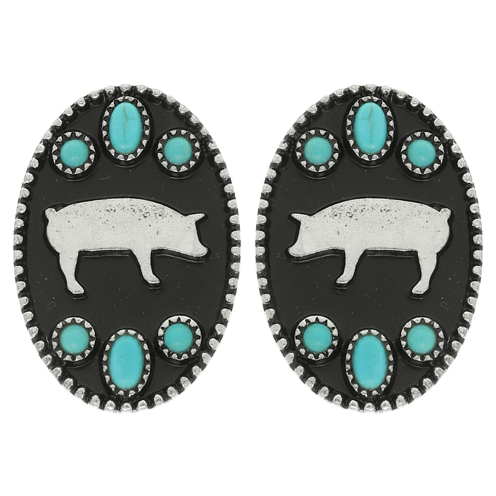 WESTERN OVAL PIG SILHOUETTE STUD EARRINGS WITH TURQUOISE ACCENTS