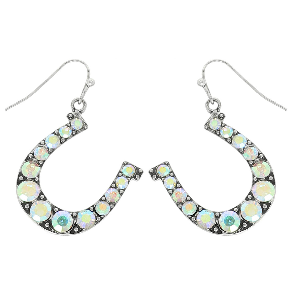 WESTERN CRYSTAL HORSESHOE DANGLE EARRINGS IN OXIDIZED SILVER TONE METAL