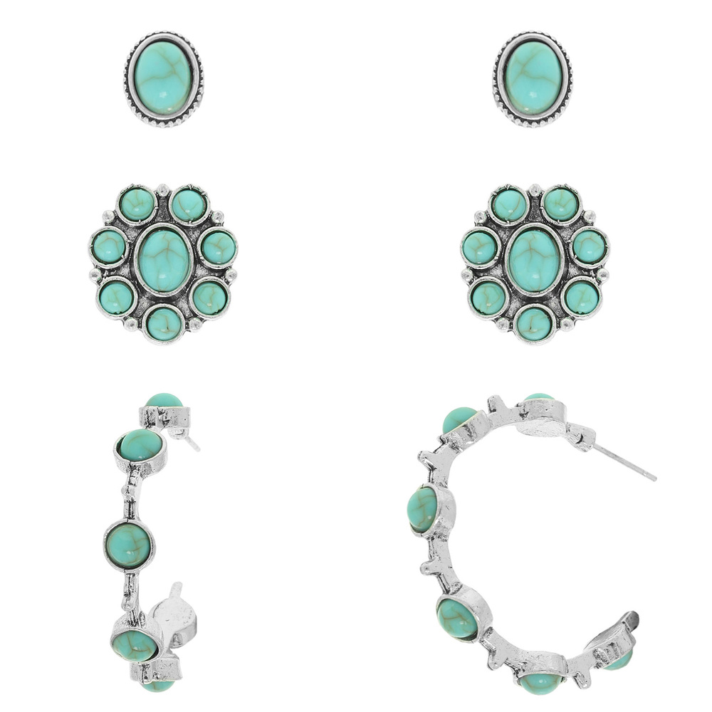 WESTERN FLORAL 3 PAIR SET WITH TURQUOISE FLOWER STUDS AND HOOPS
