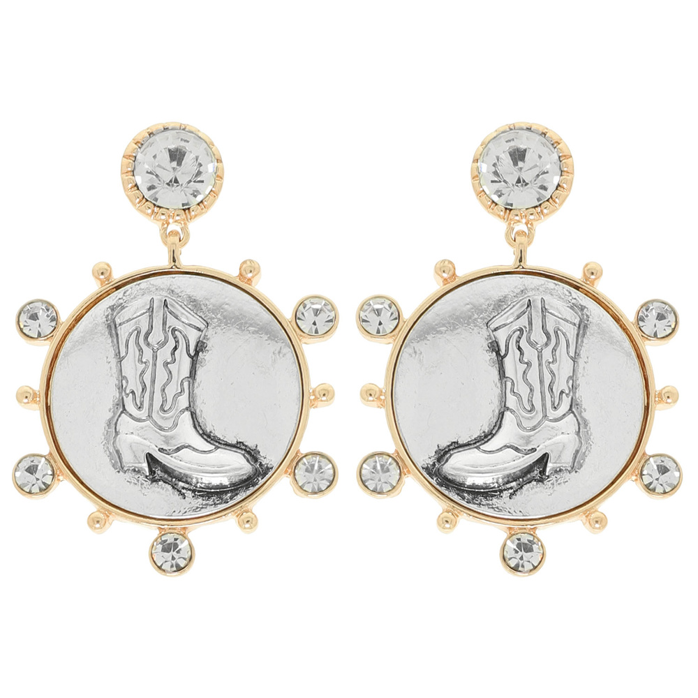 WESTERN TWO-TONE COWBOY BOOT WITH CRYSTAL HALO DROP EARRINGS