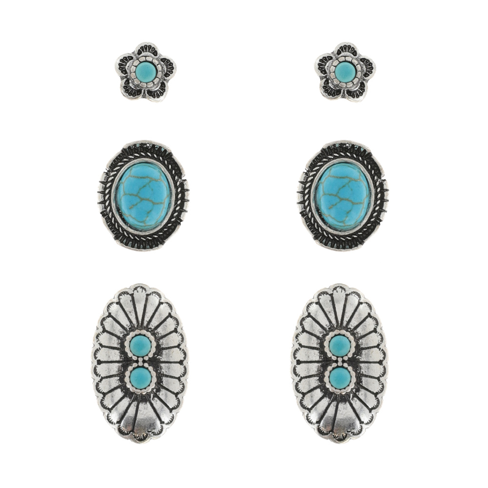 3 PAIR SET CONCHO -WESTERN THEMED TURQUOISE STUD EARRINGS IN SILVER TONE OXIDIZED METAL