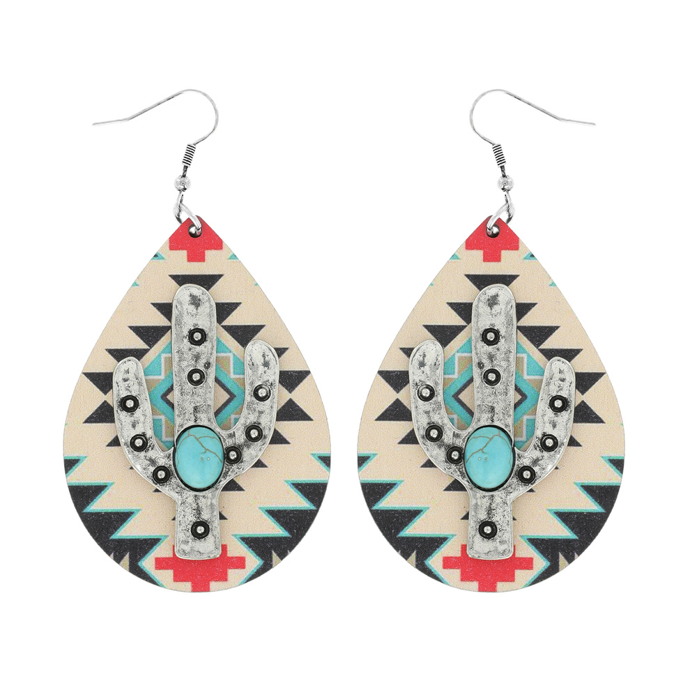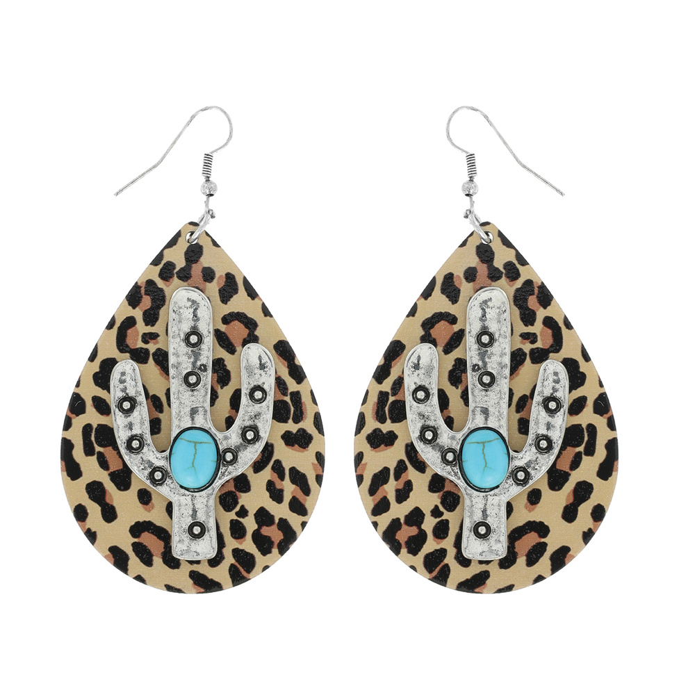 Western Leopard Print Wooden Teardrop Drop Turquoise Stone Cactus Earrings