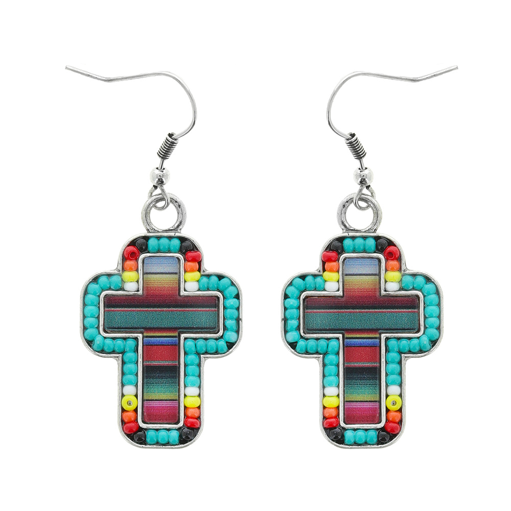 Seed Bead Leopard/ Aztec/serape Print Cross Shaped Charm Drop Earrings