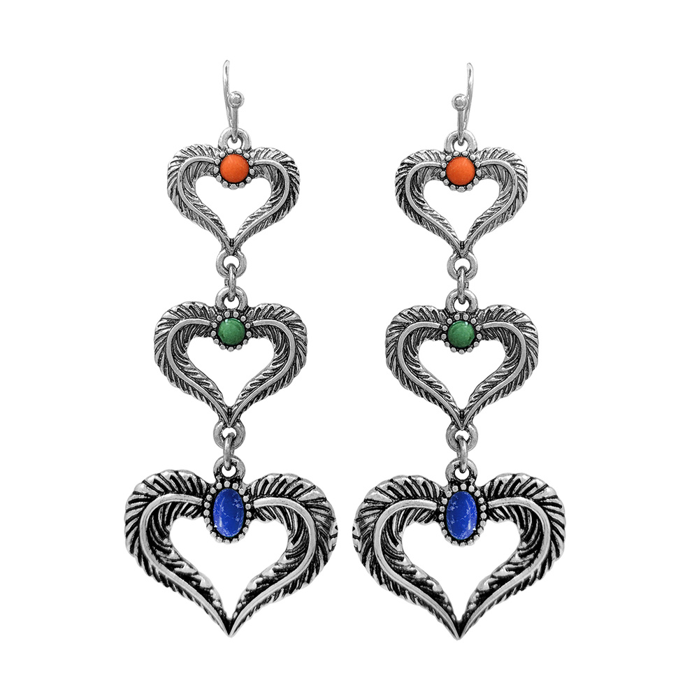 Western 3-tier Semi Stone Open Heart Metal Dangle Earrings