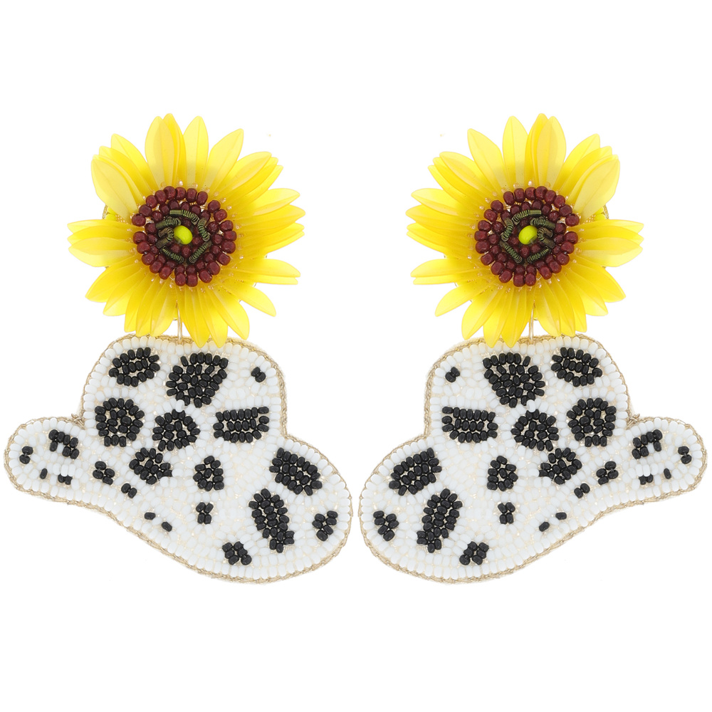 FASHION STATEMENT SUNFLOWER POST SEED BEAD COW PRINT COWBOY HAT DROP EARRINGS