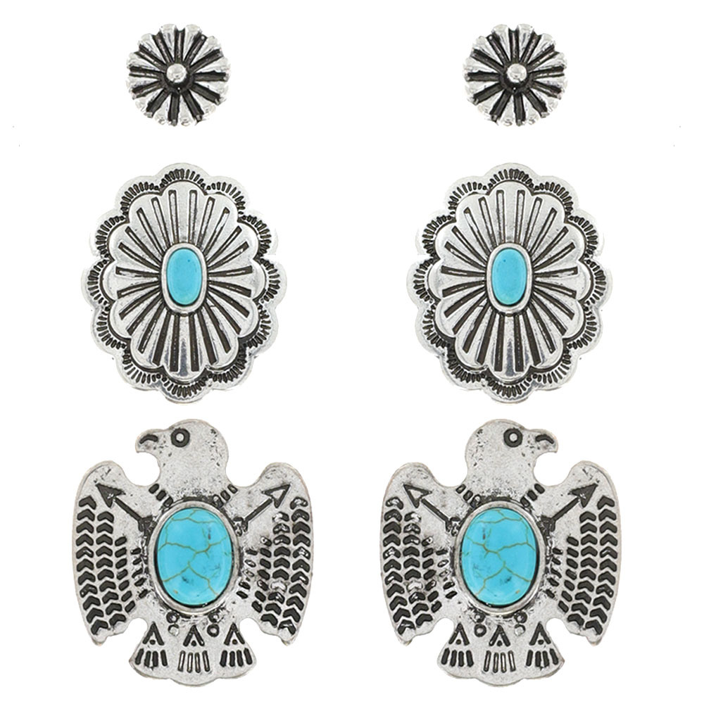 AMERICAN EAGLE - 3 PAIR SET WESTERN THEMED TURQUOISE STONE CONCHO STUD EARRINGS