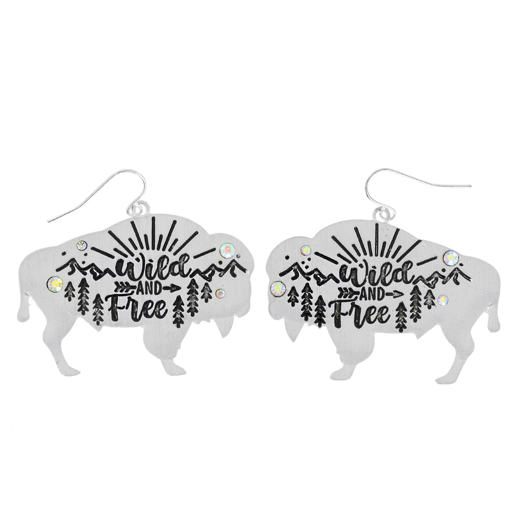 Buffalo :"wild And Free" - Western Themed Rhinestone Accent Dangle And Drop Hook Earrings