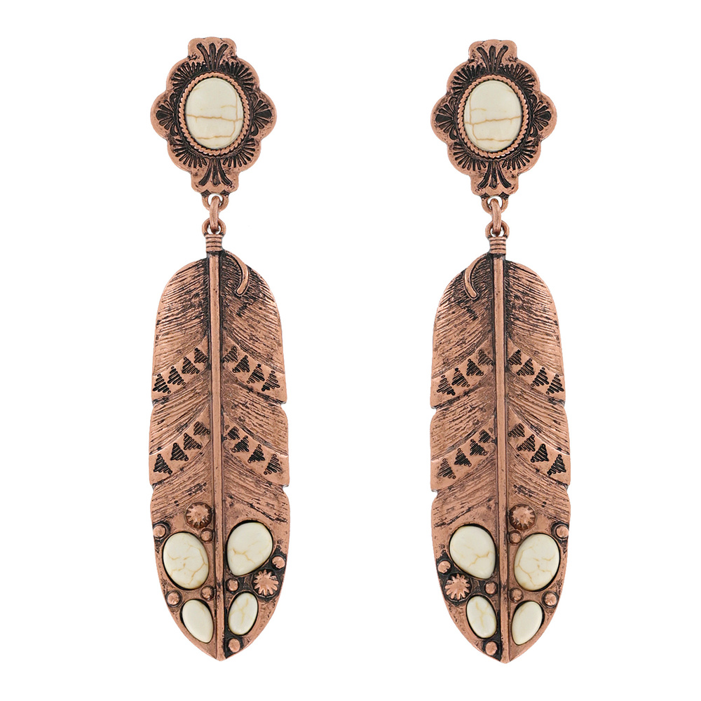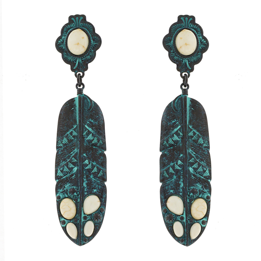 Western Turquoise Synthetic Semi Stone Feather Shaped Linear Dangle And Drop Earrings