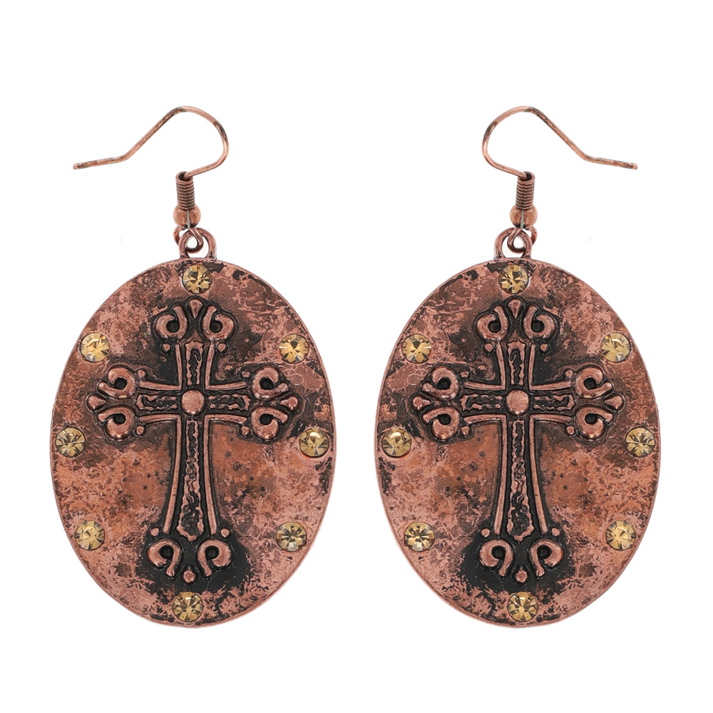 Western Crystal Rhinestone Studded Cross Oval Dangle And Drop Earrings