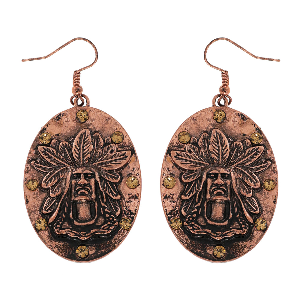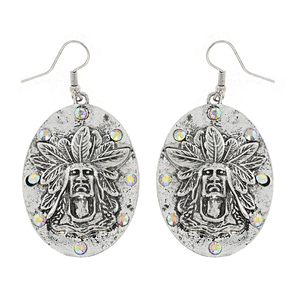 Western Crystal Rhinestone Studded Chief Head Oval Dangle And Drop Earrings