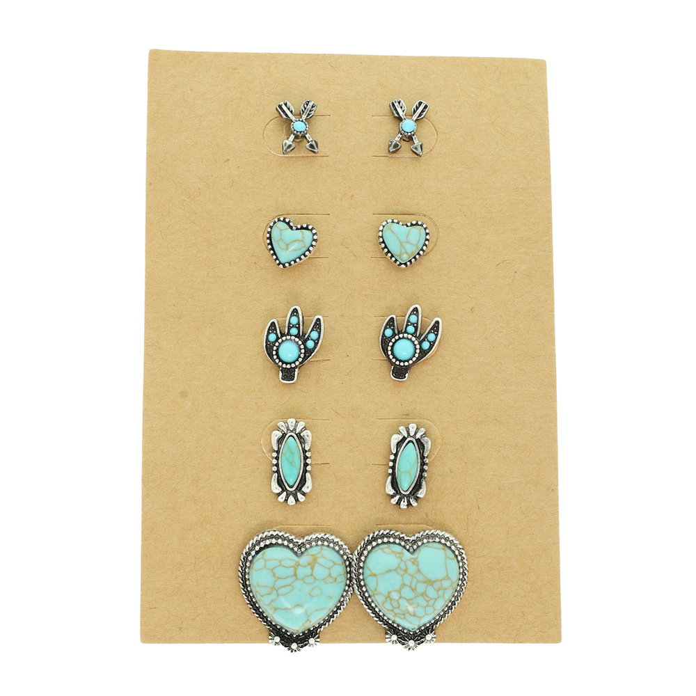 WESTERN ASSORTED TURQUOISE STUD EARRINGS SET IN OXIDIZED SILVER-TONE METAL