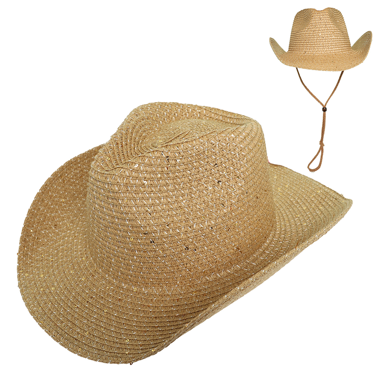 WESTERN SEQUIN WIDE BRIM STRAW WOVEN COWBOY HAT WITH STAMPEDE STRING