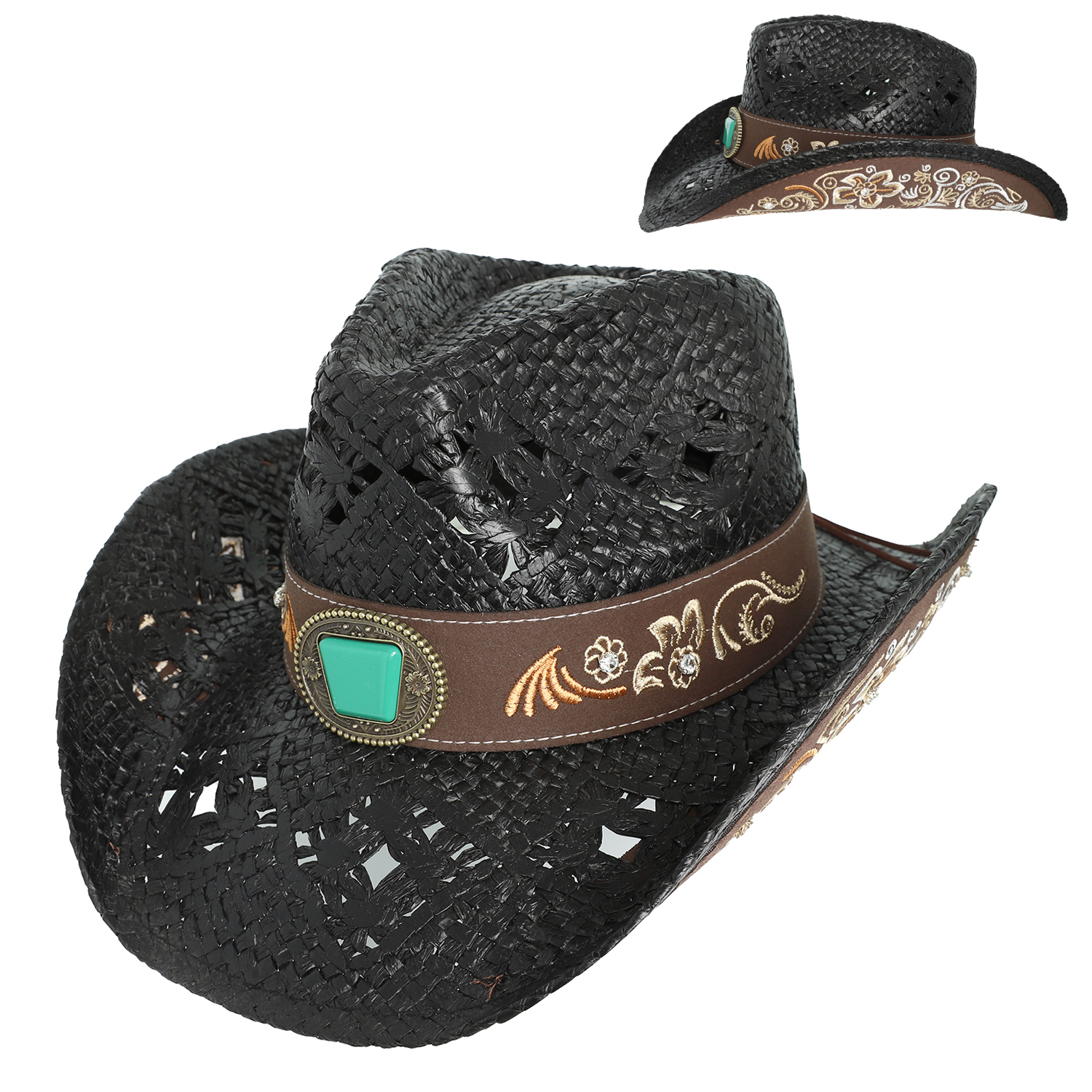 STRAW WOVEN HOLLOW CUT COWBOY HAT WITH DECORATIVE TURQUOISE HAT BAND