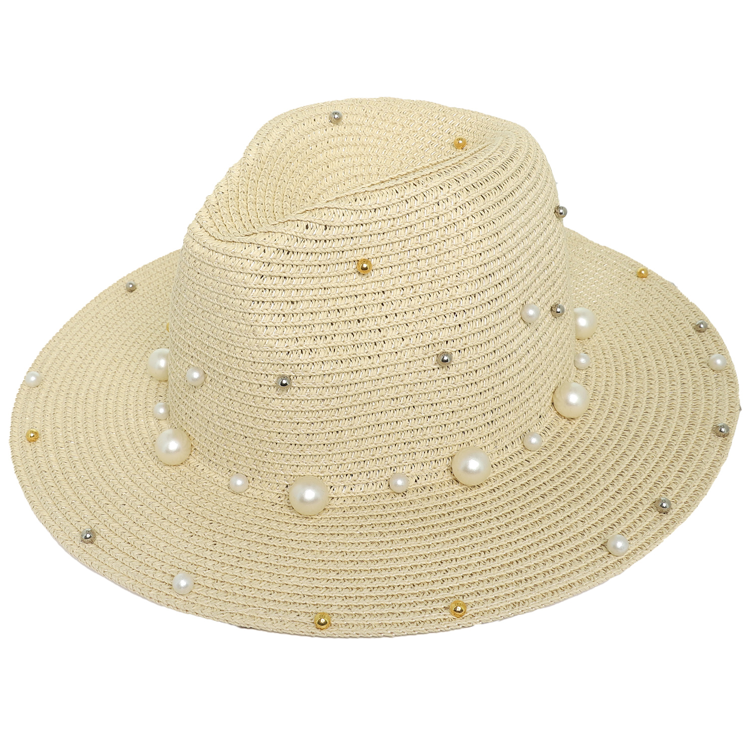 STRAW WOVEN METALLIC PEARL EMBELLISHED SUN HAT