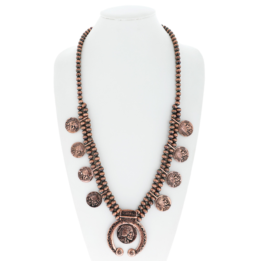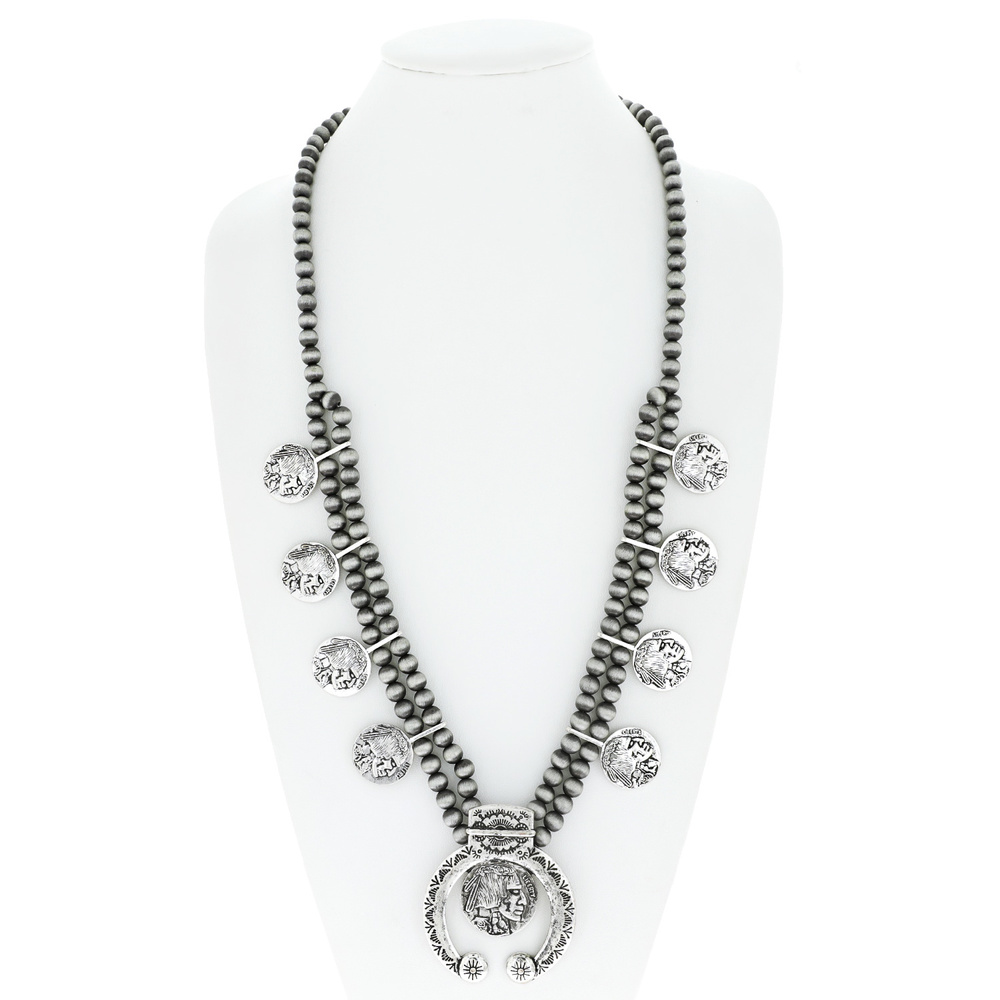 Western Squash Blossom Adjustable Navajo Pearl Beaded Indian Head Coin Pendant Necklace