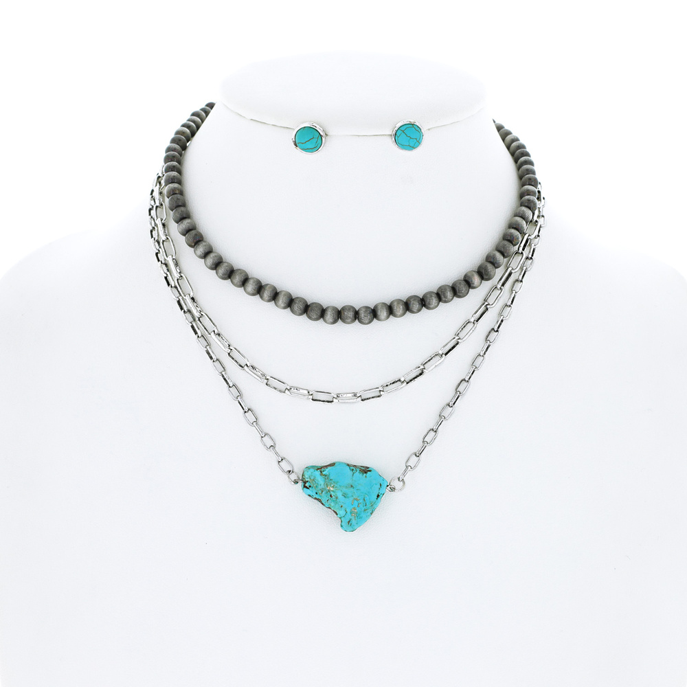 Western Navajo Pearl Multistrand Adjustable Layering Beaded Chain Turquoise Slab Necklace Earring Set