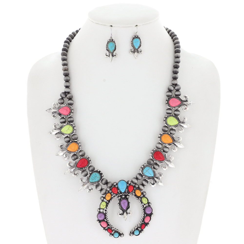 24" Western Turquoise Semi Stone Squash Blossom Adjustable Necklace Earring Set