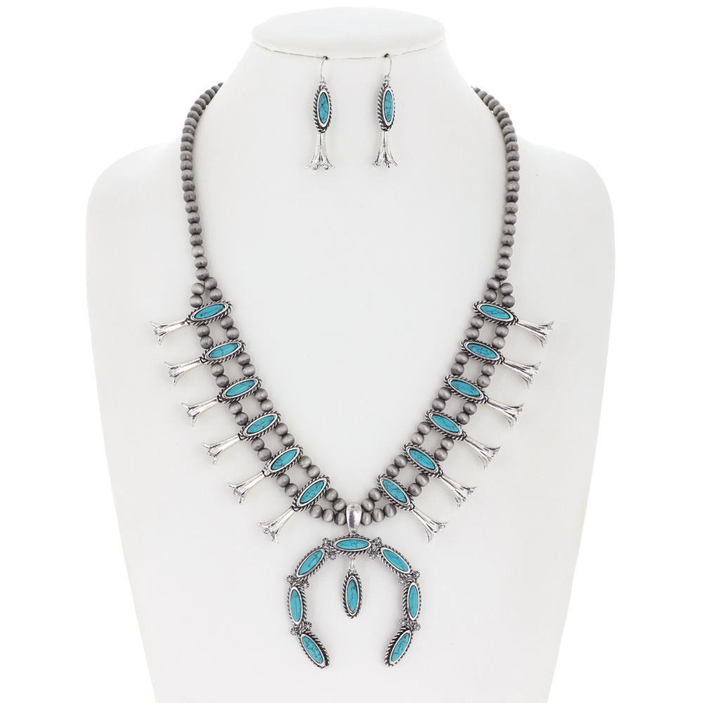 24" Western Navajo Pearl Squash Blossom Turquoise Semi Stone Adjustable Beaded Necklace Earrings Set