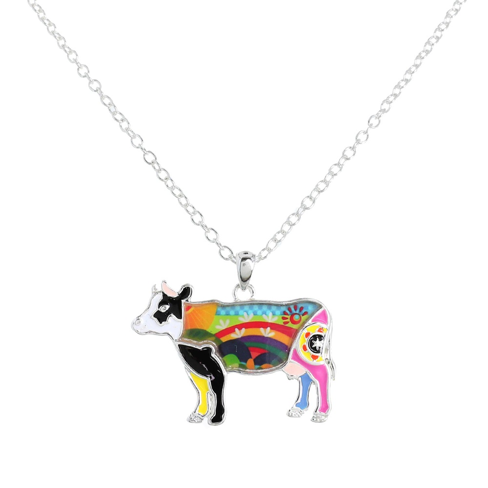 Western Multicolor Enamel Coated Cow Adjustable Pendant Necklace In Silver Tone Metal